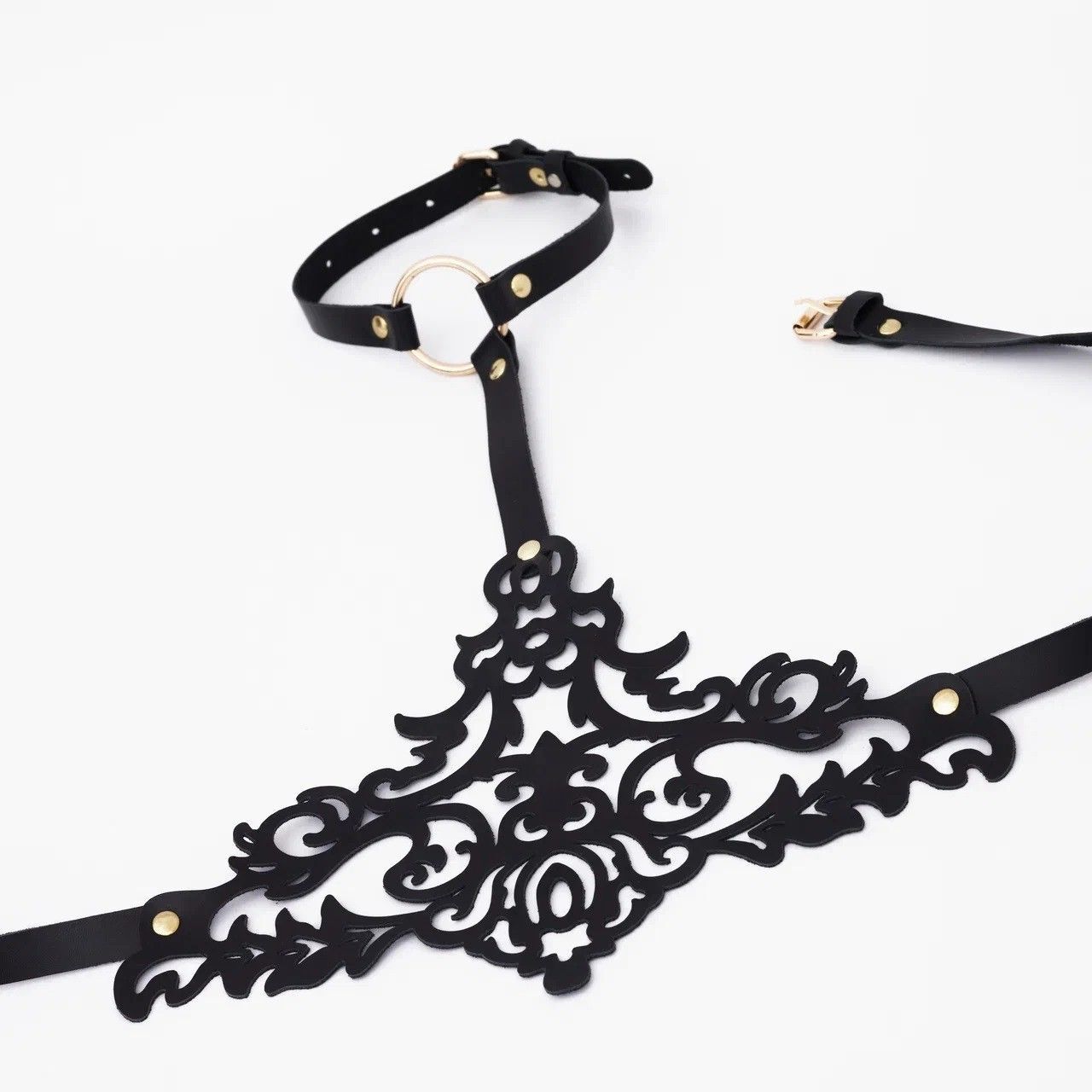 Эта резная портупея изготовлена из черной натуральной кожи и дополнена золотистой фурнитурой высокого качества. Ремешки соединены между собой кольцами и клепками. Благодаря большому диапазону регулировок портупея великолепно будет смотреться практически на любой фигуре. Доставляется в фирменной упаковке в виде брендированной деревянной коробки.