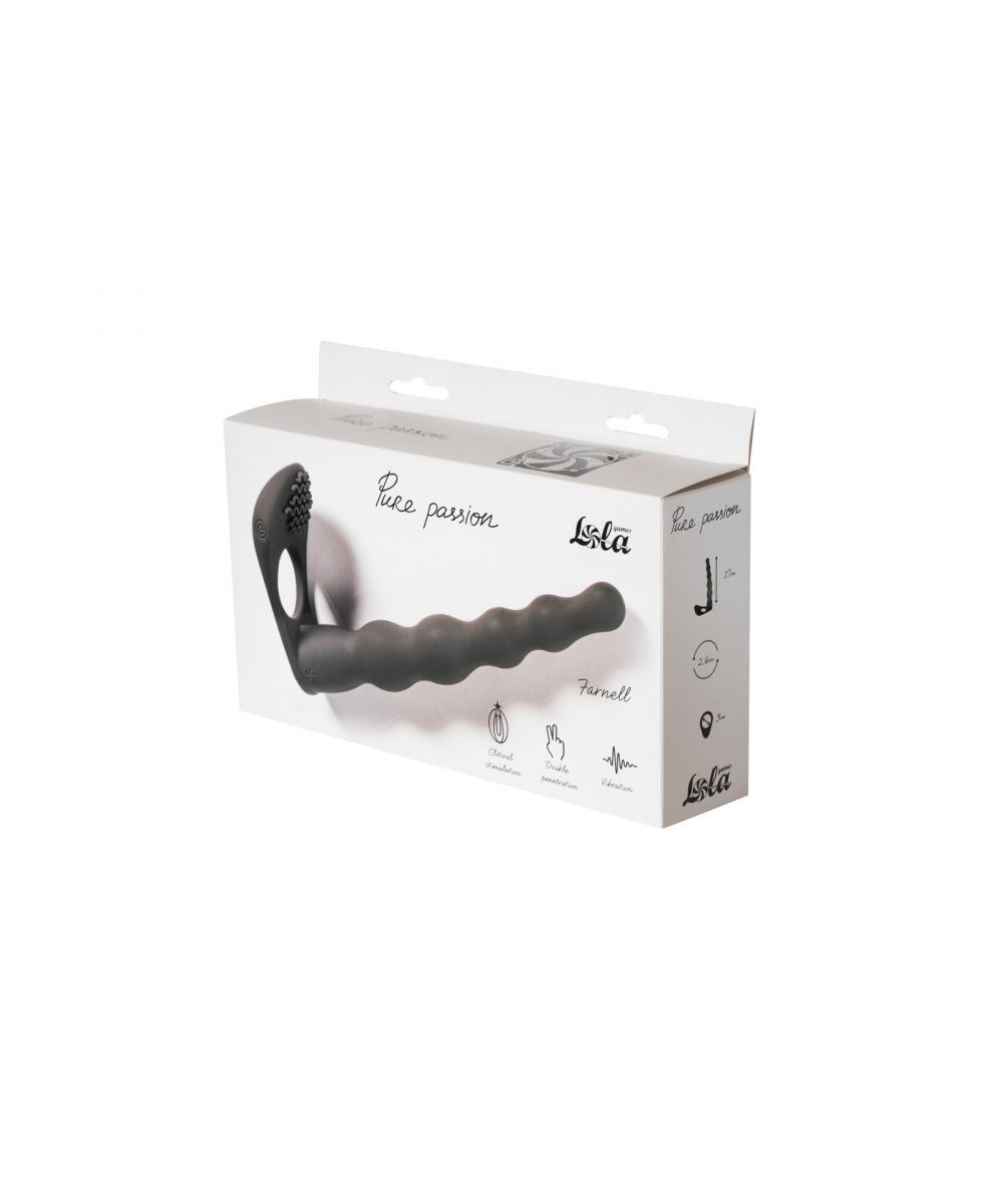 Черная насадка для двойного проникновения Farnell из гипоаллергенного силикона. Обладает рельефной и гибкой формой. Надежно крепится у основания члена благодаря силиконовому кольцу. Кольцо хорошо тянется и подходит на любой размер. Вибропуля в верхней части для клиторальной стимуляции добавит приятных ощущений партнёрше. Работает от батареек-таблеток, которые входят в комплект. Внутренний диаметр кольца – 2,6 см.