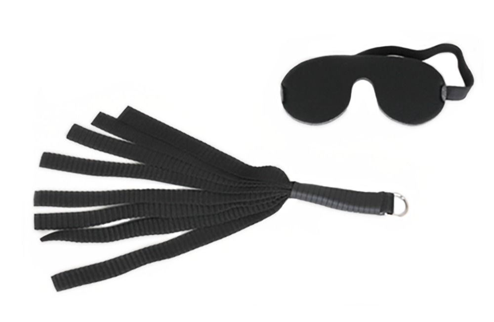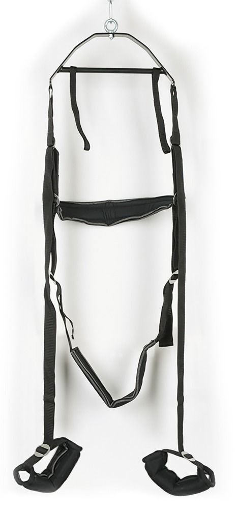 Черные секс-качели из широких ремней. Ремни регулируются по длине, чтобы вы могли настроить их для идеального расположения партнера. В комплекте маска на глаза и плеть. Выдерживают вес до 100 кг.