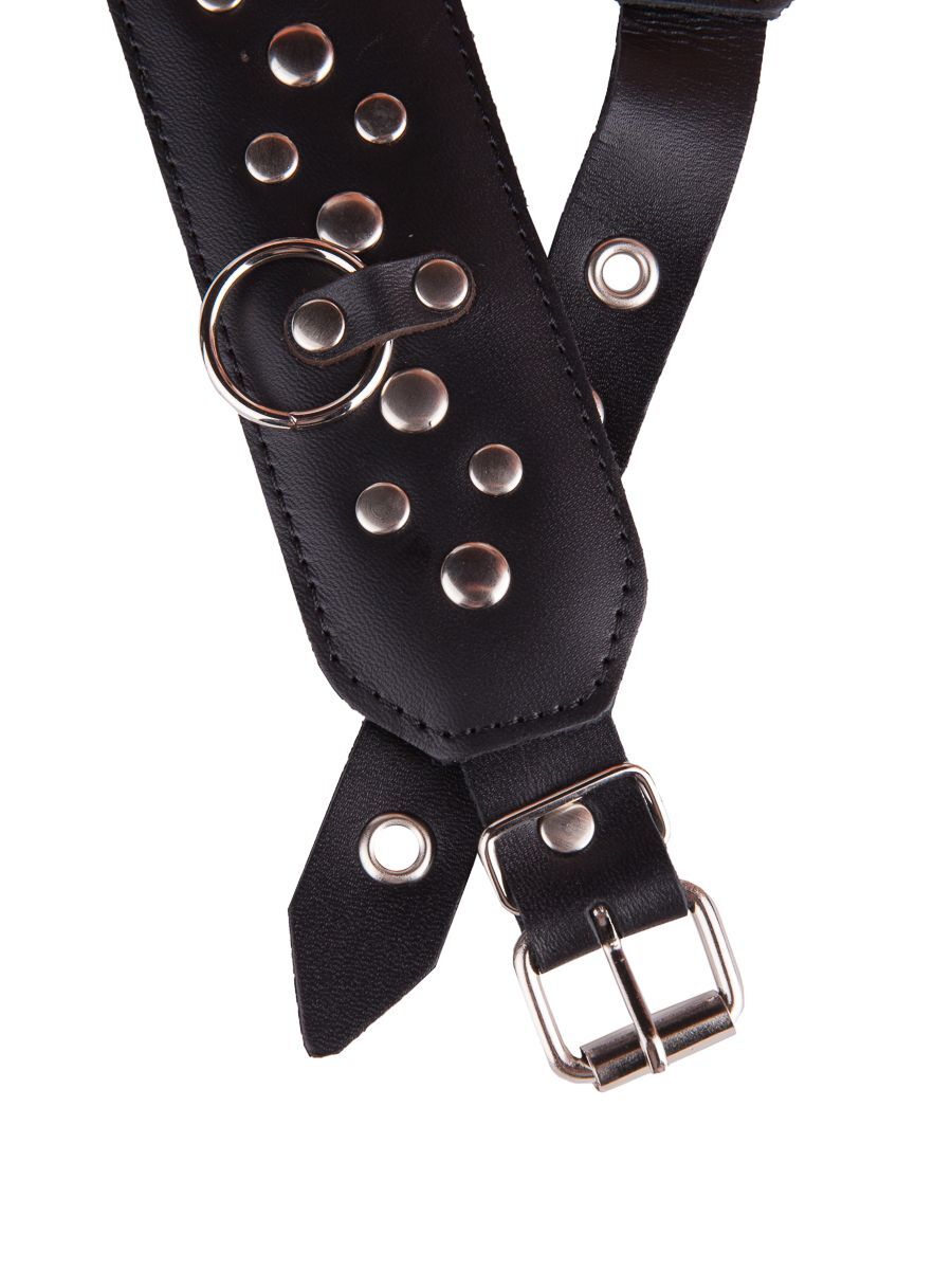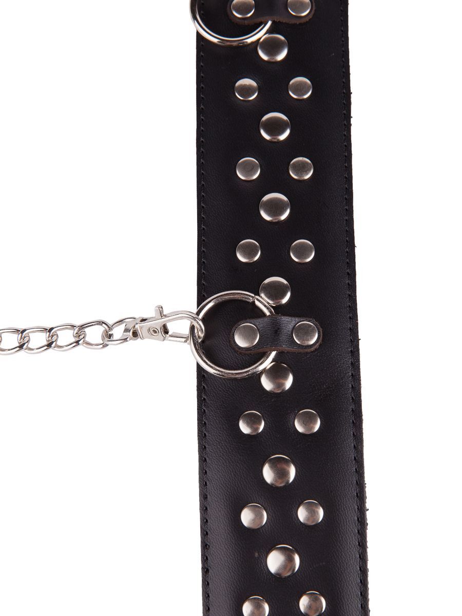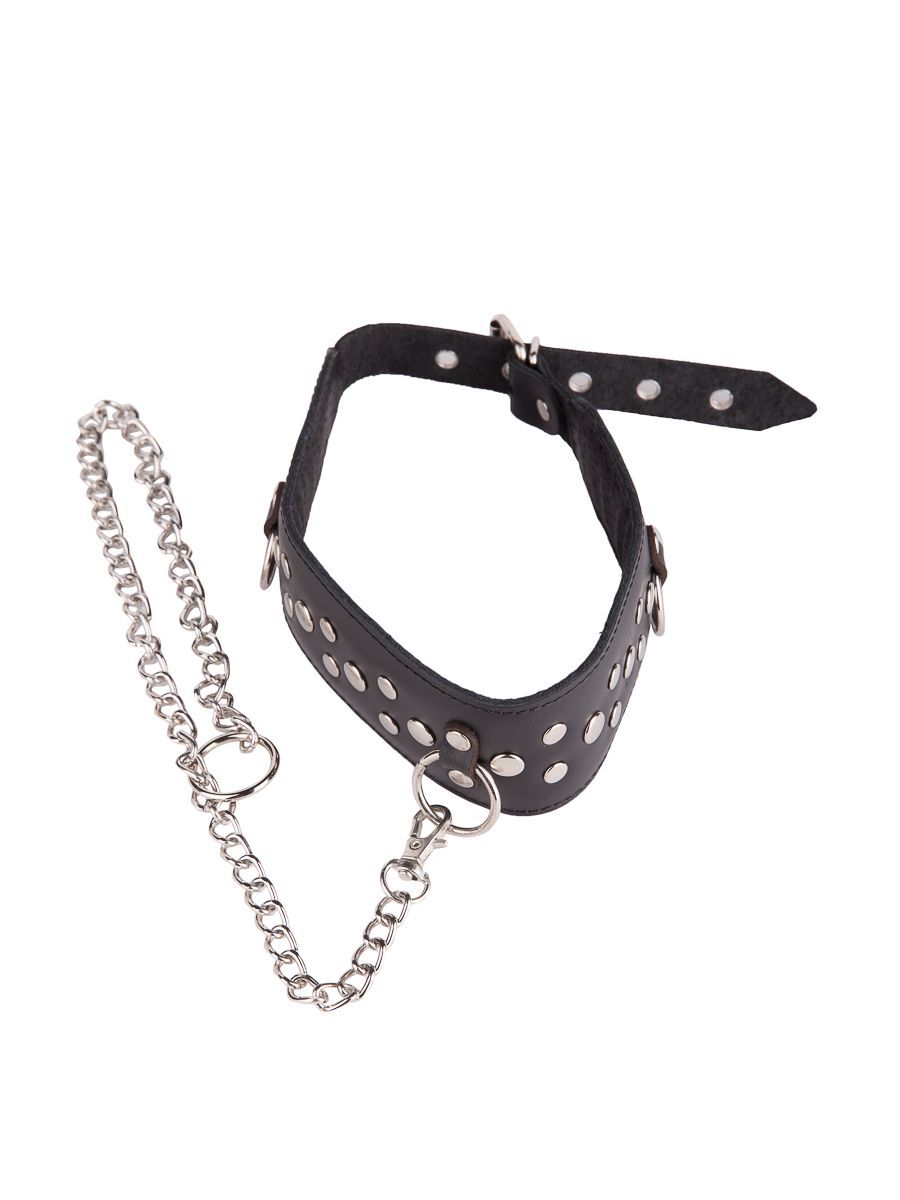 Изготовлен из натуральной кожи с велюровой подкладой. При изготовлении использована никелированная фурнитура. Размер универсальный. Ширина ошейника - 4,5 см. Длина поводка с карабином - 50 см.