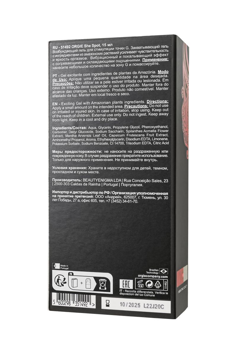 Интимный гель для точки G ORGIE She Spot – ваш путь к невероятным ощущениям. Этот гель создан для удовольствия. Забудьте о рутине и откройте новый мир возможностей с интенсивным вибрационным и покалывающим эффектом. Формула She Spot, обогащенная активными ингредиентами, приносит непередаваемые ощущения, которые усиливаются развивающимися согревающими, охлаждающими и даже легкими пряными нотками. В этот момент вы ощущаете нечто невероятное, словно погружаясь в водопад наслаждения. Однако этот интимный гель не только для нее. Этот продукт разработан так, чтобы партнеры могли наслаждаться им вдвоем. Он создает возможность делиться моментами удовольствия и экспериментировать с новыми ощущениями вдвоем. Специально разработанный для стимуляции точки G, гель делает еще более чувствительным каждое прикосновение. Продукт прошел строгие исследования, включая дерматологические и гинекологические тесты, а также исследования эффективности. Простота использования – еще одно его преимущество. Просто нанесите небольшое количество на интимные зоны и позвольте магии начать действовать. Orgie рекомендует начать с минимальной дозы и настроить дозировку в соответствии с вашими желаниями и комфортом. Функция интимного геля ORGIE She Spot заключается в создании мгновенных интенсивных ощущений для женщин и для пар. Откройте дверь в волшебный новый мир удовольствия с этим уникальным гелем.