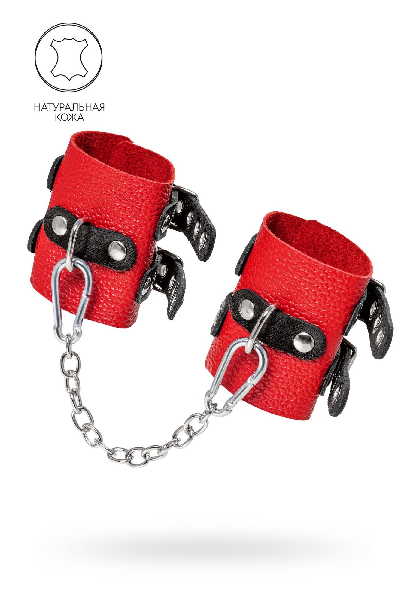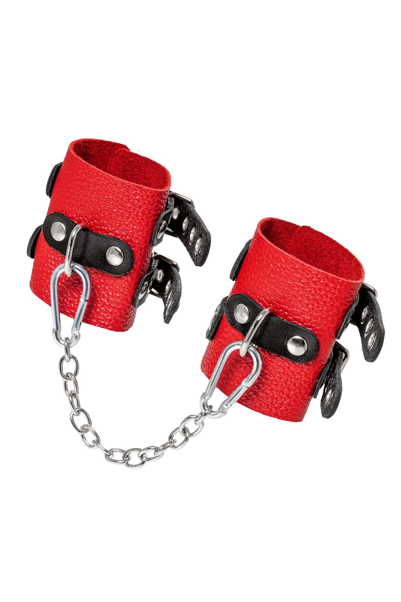 Не бойтесь своих желаний! Основатели бренда уверены: лучший способ избавиться от искушения - поддаться ему! Мягкие, красные, кожаные наручники с двумя чёрными, жёсткими ремнями могут стать стильным аксессуаром, а могут послужить вашим целям по своему прямому назначению. Частичное обездвиживание и невозможность двигать руками дают вам полную власть над партнером – взрослые игры для взрослых. Наличие двух колец и карабинов, соединенных между собой металлической цепочкой, позволяет использовать изделие как раздельно – аксессуар-манжеты, так и как наручники для фиксации. К широким металлическим кольцам также можно присоединить и другие аксессуары при помощи карабинов. Благодаря универсальному размеру наручники могут использоваться и мужчинами, и женщинами. Длина манжет - 18 см, ширина - 7 см.