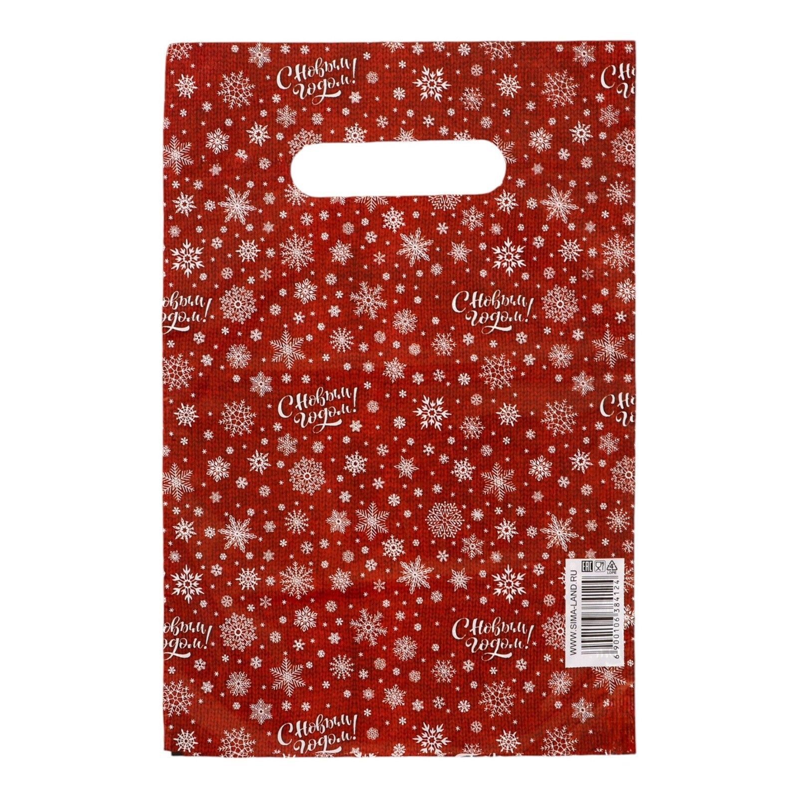 Красный подарочный новогодний пакет с вырубной ручкой (20х30 см).