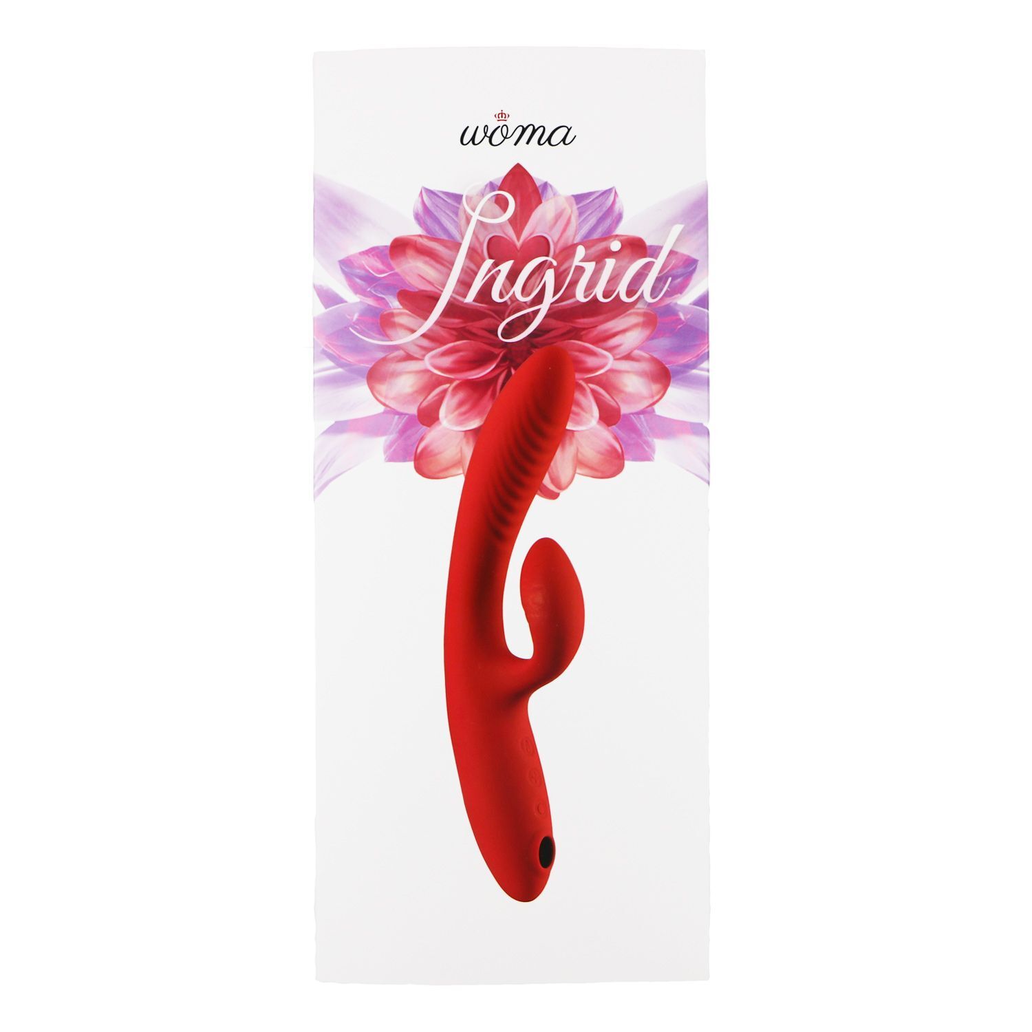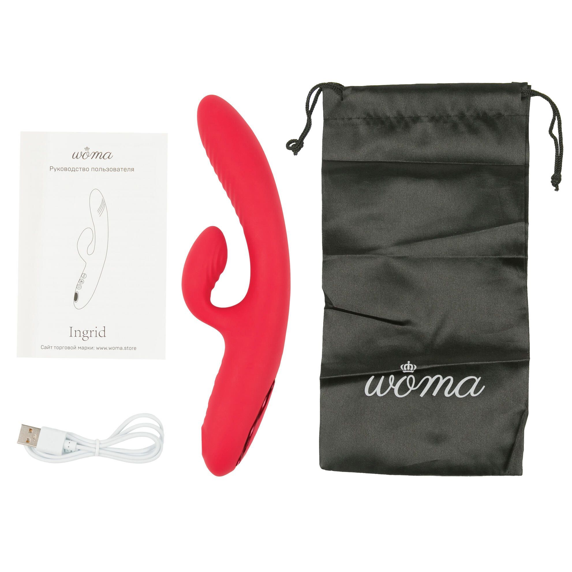 Woma Ingrid – красивый многофункциональный вибратор-кролик с вакуумным стимулятором. Каждая часть игрушки функциональна: вагинальный и клиторальный отростки обеспечивают двойную стимуляцию чувствительных зон, а в ручке вибратора расположен вакуумный стимулятор клитора. Вагинальный и клиторальный отростки Ingrid гибкие и подстраиваются под любую анатомию, а их рельеф дополнительно стимулирует вагину и вульву. Вибрация в отростках управляется одной кнопкой и переключается по кругу, так что в процессе вам не придётся думать о том, куда нажать. В ручке Ingrid расположен вакуумный стимулятор клитора. Независимый мотор, управляемый отдельной кнопкой, обеспечивает 5 различных режимов стимуляции. Всеми функциями Ingrid очень просто управлять, ведь для каждой есть отдельная кнопка со световым индикатором. Если вы хотите, чтобы вибратор нагрелся перед тем, как вы будете его использовать, нажмите и удерживайте 3 секунды кнопку включения нагрева (кнопка с градусником). Световая индикация подскажет, что нагрев включен. Повторите то же действие, если хотите отключить нагрев. Чтобы включить или выключить вибрацию, нажмите и удерживайте 3 секунды среднюю кнопку. Короткое нажатие на эту кнопку переключает 10 режимов вибрации по кругу. Нажмите и удерживайте в течение 3 секунд нижнюю кнопку «O» для включения или выключения вакуумного стимулятора. Коротким нажатием на эту кнопку можно переключать 5 режимов стимуляции.