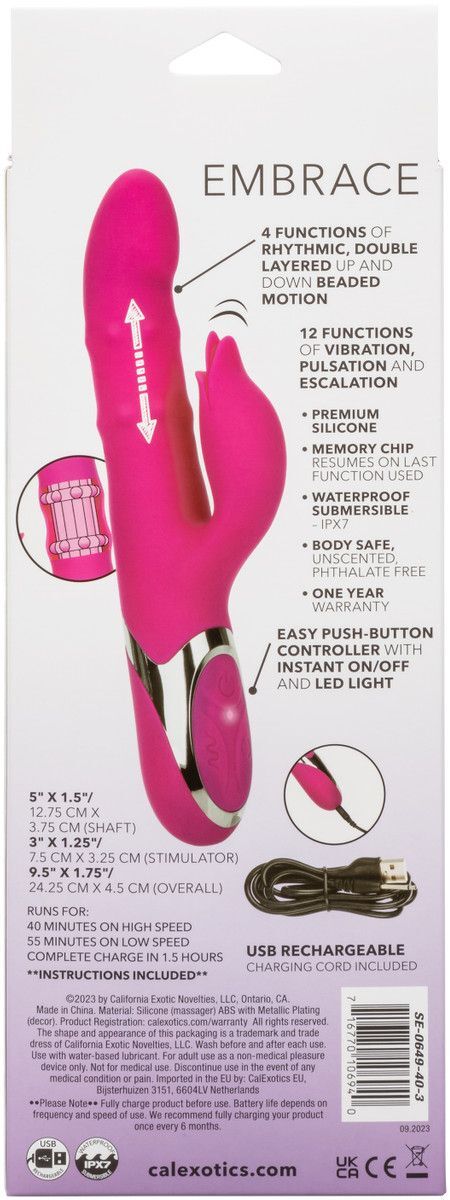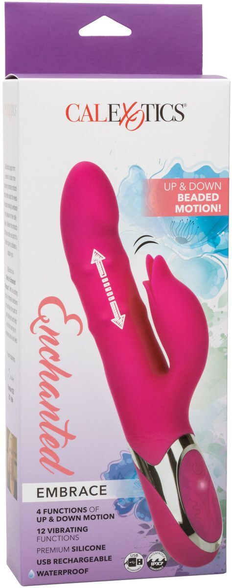Enchanted Embrace – перезаряжаемый вибромассажер с клиторальным отростком в форме бутона Изготовлен из бесшовного, гипоаллергенного, безопасного для тела, не содержащего фталатов силикона премиум-класса, не имеет без запаха. Два мощных мотора обеспечивает 12 интенсивных режимов вибрации и 4 функции пенетрации бусинами по всему стволу.Девайс снабжен высокотехнологичным чипом памяти, который позволяет запомнить последний режим выбранной вибрации и включается именно с него, не требуя снова искать предпочитаемую функцию.Игрушка имеет удобное управление с помощью easy-touch. Вибромассажер заряжается через USB и может быть подключен практически в любом месте, просто подсоедините идущий в комплекте шнур к совместимому порту компьютера или USB-адаптера (приобретается отдельно), а противоположный конец со штекером к игрушке. Полная зарядка занимает 1,5 часа, ее достаточно для беспрерывной работы до 40 минут высокоскоростной стимуляции или 55 минут на низкоскоростные вибрации. В то время как 3-кнопочная панель easy-touch управляет интенсивностью. Рабочая длина - 12,75 см.