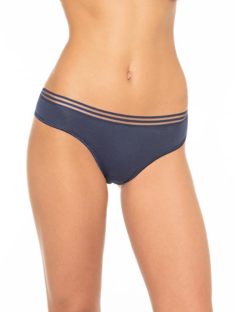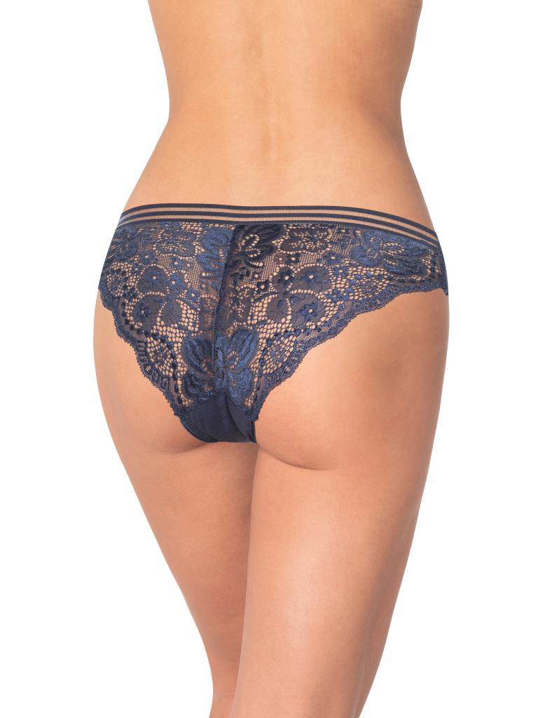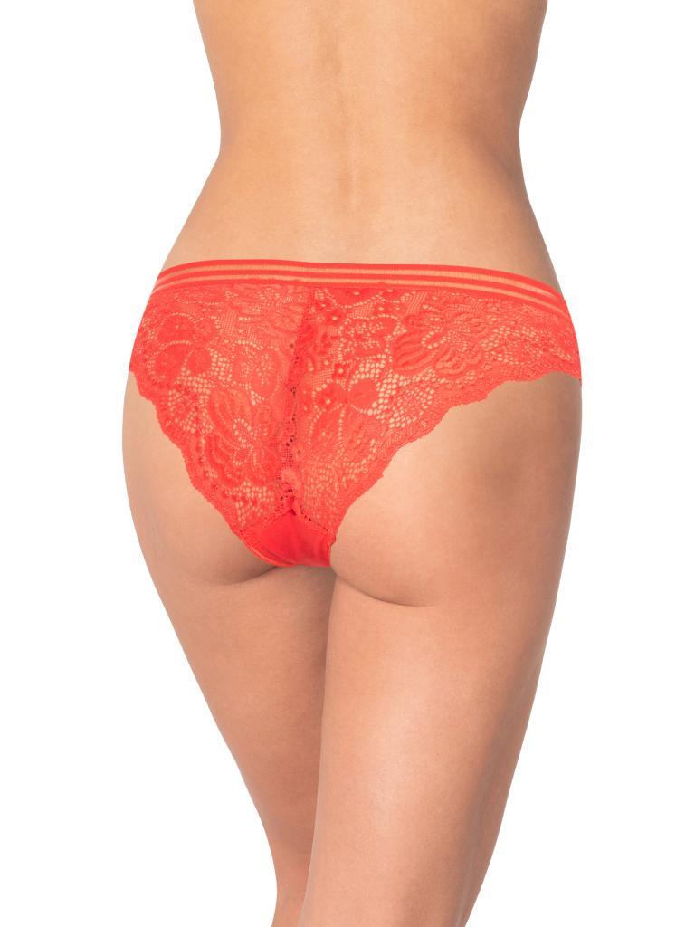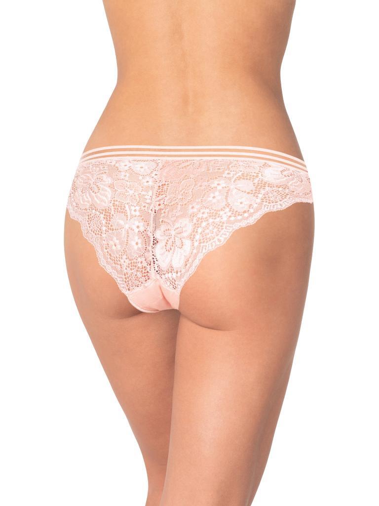 Трусы-бразилианы со средней линией талии. Передняя деталь выполнена из мягкого хлопка со спандексом. Задняя деталь из кружева с цветочным рисунком. Привлекательный акцент - широкая резинка с прозрачными элементами.